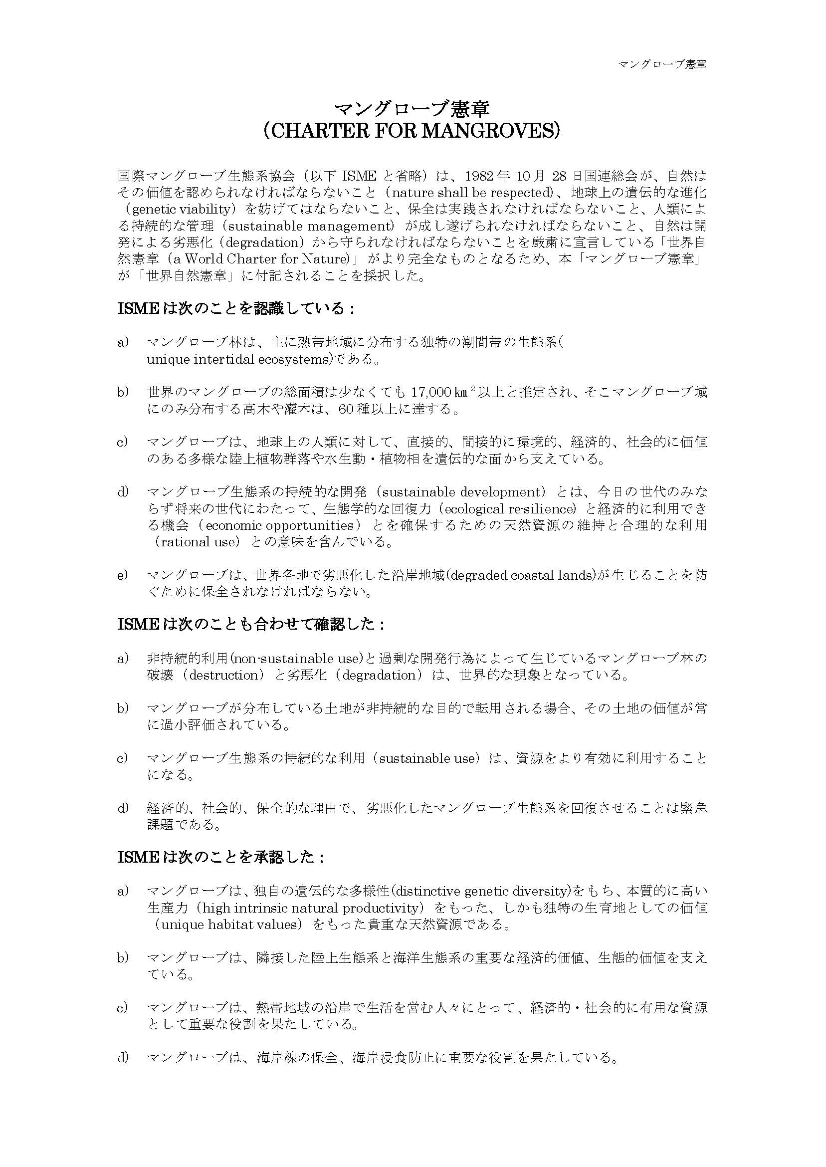 The Executive Committee of ISME at its first meeting decided to draft a Charter for Mangroves that complements a World Charter for Nature of the United Nations. ISME's Charter for Mangroves was first drafted in 1991, and finalized in 1992. The importance of the Charter for Mangroves lies in setting forth principles for the utilisation of mangrove ecosystems, to be reflected in the laws and practices, at local, national and international levels.
